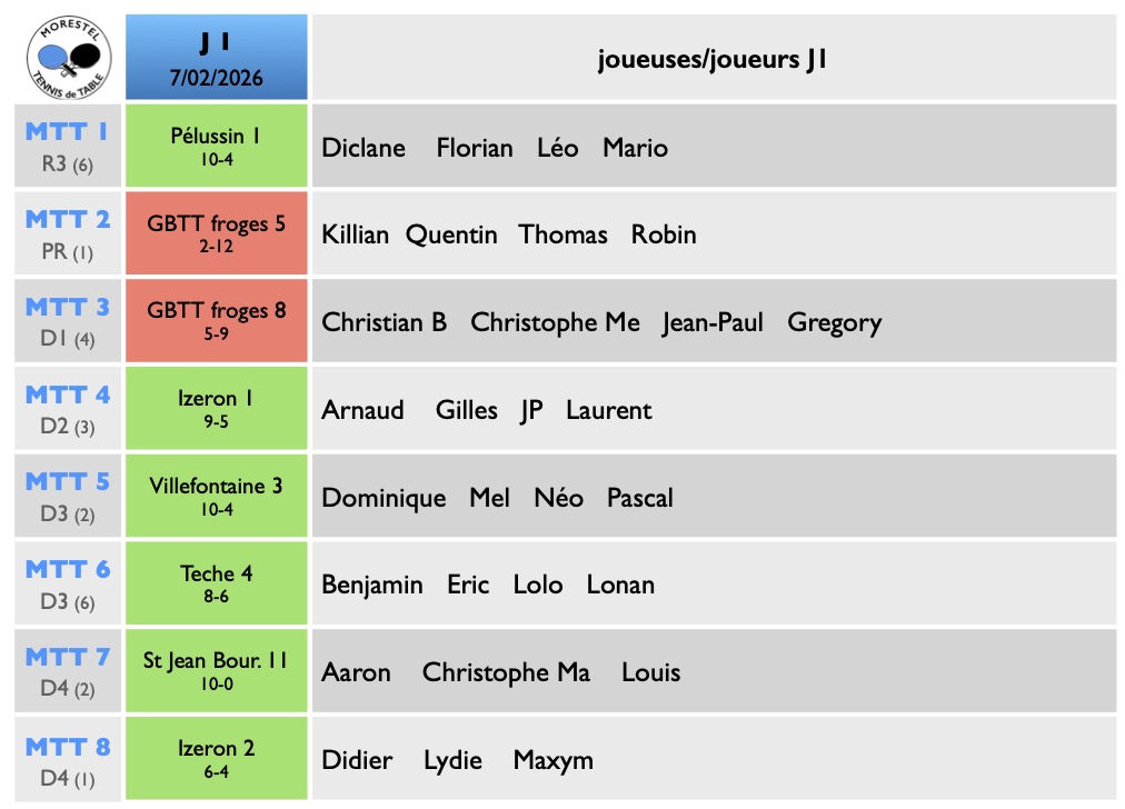 MTT3 monte en Départementale 2 (après sa montée l’année dernière !), les quatre autres équipes se maintiennent, y compris MTT1 après sa montée en pré-régional l’année dernière également : encore une bonne phase pour le club de Morestel.